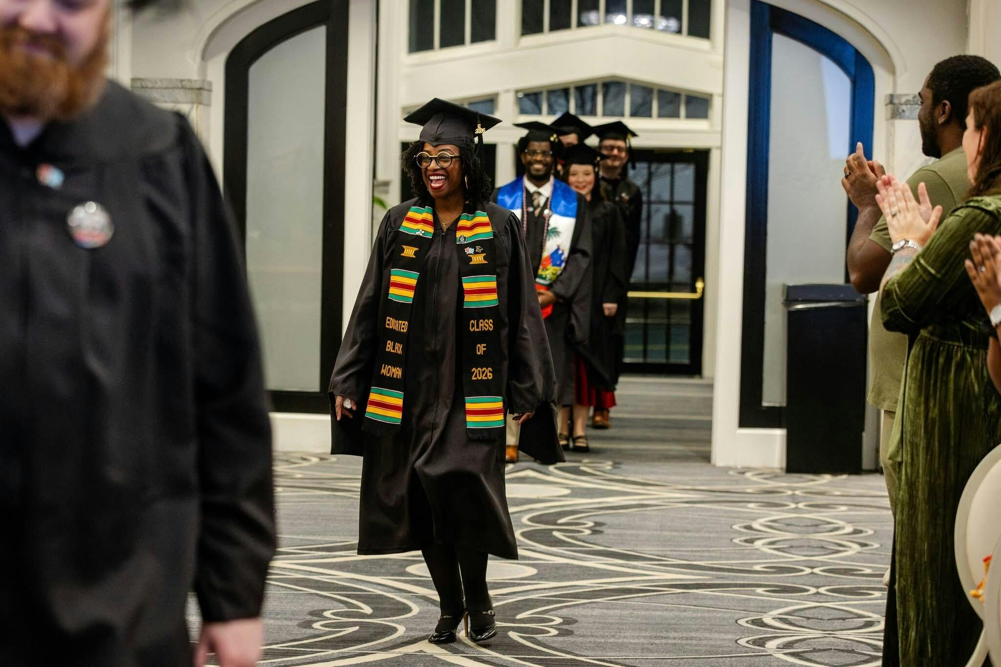 As a non-traditional aged student returning to earn my MFA in Theatre, I knew I wanted a stole that represented my journey and acknowledge the triumph of earning another degree in a field I’ve always wanted be in. Walking down the aisle, I proudly wore this store as a symbol of what I’d overcome and a reminder that YES, I do belong in spaces that might otherwise be threatened bc of the hard work and resilience that was placed in me from the beginning of time..(THANK YOU GOD)!!