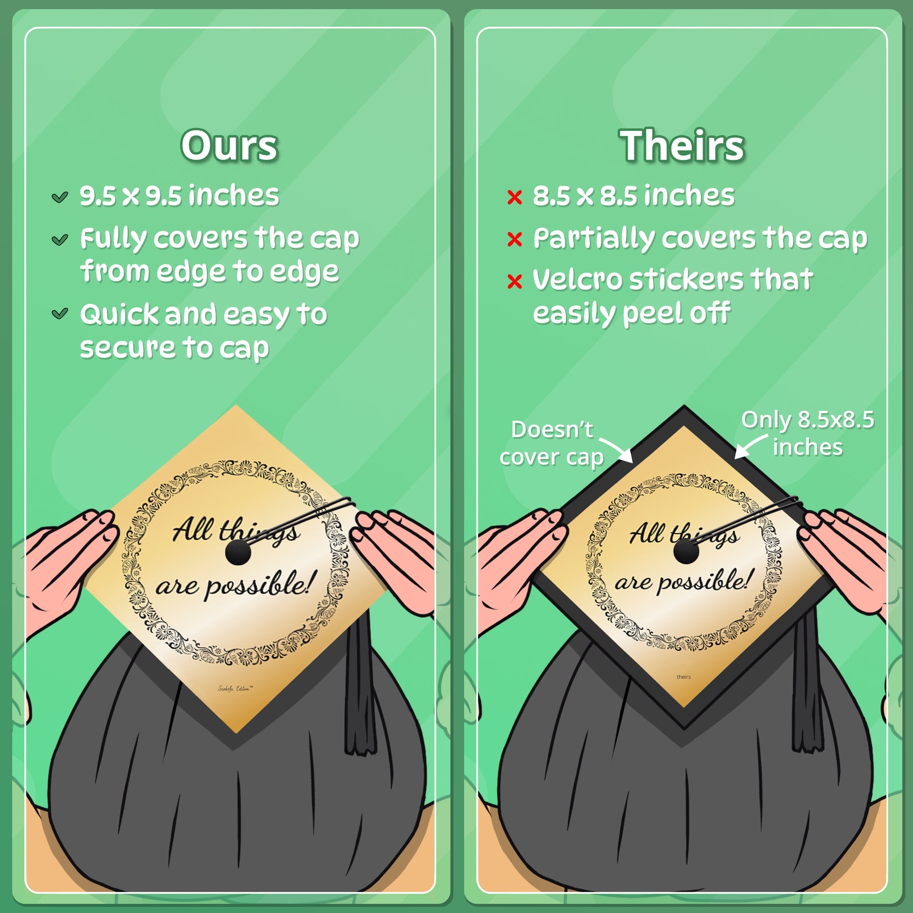 PERFECTLY SIZED - Measures 9.5 inches by 9.5 inches. The design perfectly covers your graduation cap. Comes with a hole in the middle so you can easily move your tassel from one side to the other when your ceremony is over!